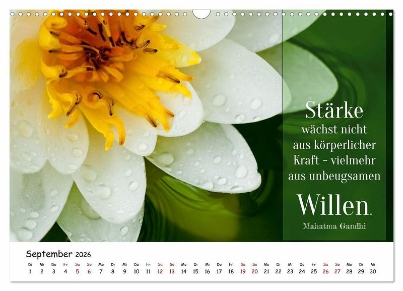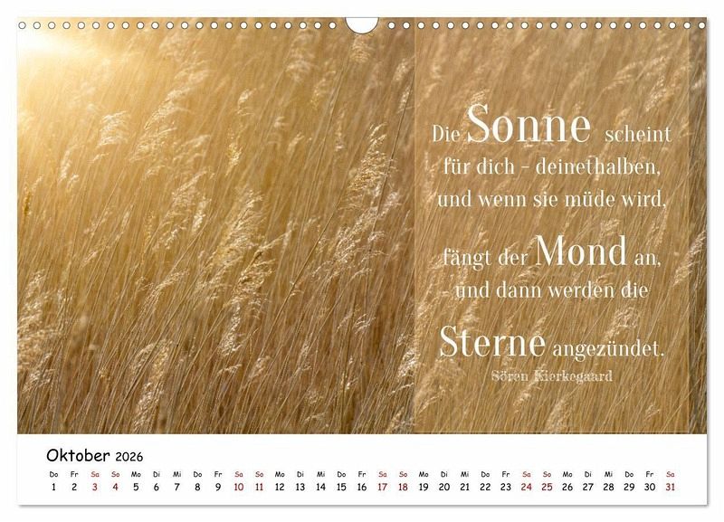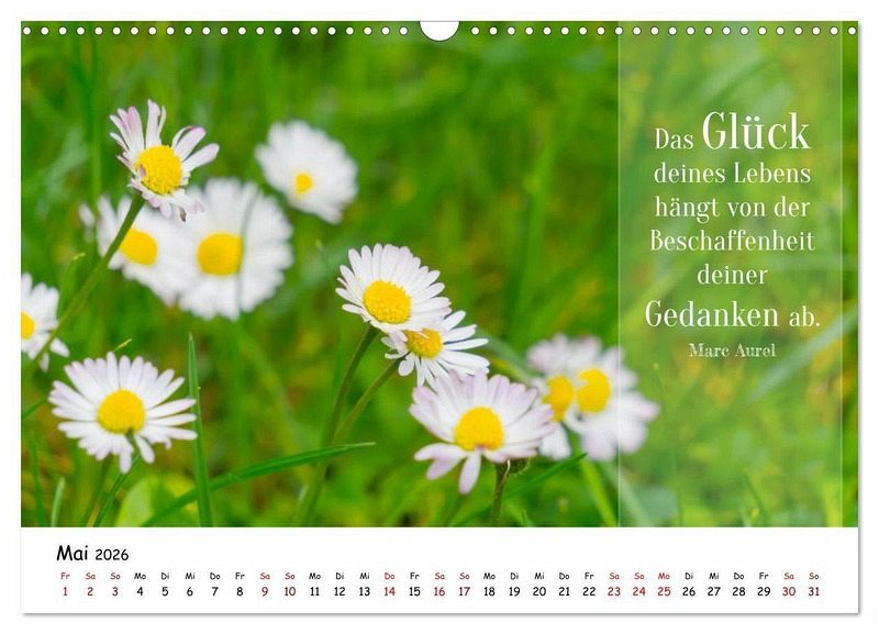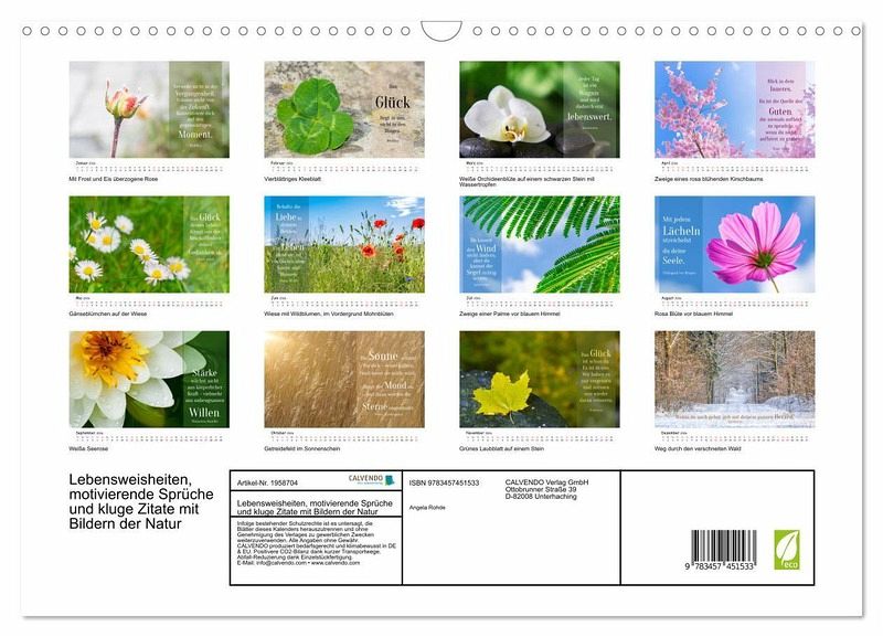 Ein Jahr voller Inspiration. Entdecken Sie diesen einzigartigen Kalender, der Ihnen jeden Monat eine Portion Weisheit, Motivation und Freude ins Leben bringt. Ob kurze Gedanken, inspirierende Worte oder tiefsinnige Zitate - dieser Kalender bietet eine vielfältige Auswahl. Von Glück und Liebe über Erfolg bis hin zu Achtsamkeit - die Texte decken ein breites Spektrum ab und begleiten Sie in allen Lebenslagen. Der Kalender ist nicht nur inhaltlich, sondern auch visuell ansprechend gestaltet. Jede Seite ist ein kleines Kunstwerk, das Sie gerne auf Ihrem Schreibtisch oder an der Wand platzieren werden. Er eignet sich perfekt als Geschenk für Freunde, Familie oder Kollegen. Zeigen Sie Ihre Wertschätzung mit einem Jahr voller inspirierender Botschaften.