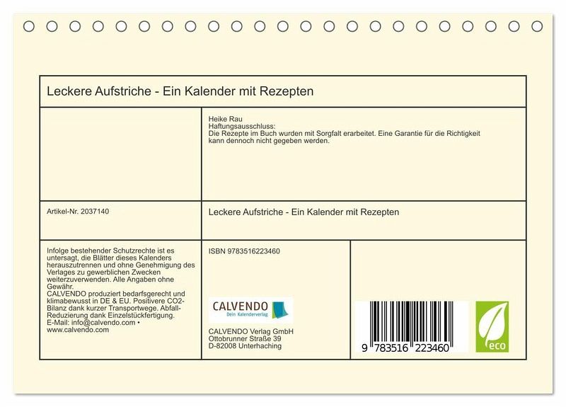 QUALITÄT - Hochwertiger Fotokalender mit 12 wunderschönen Motiven auf lichtbeständigem Bilderdruckpapier, robuste Spiralbindung.NACHHALTIG - deutliche Abfallreduzierung durch bedarfsgerechte Einzelstückfertigung, umweltfreundliches FSC-zertifiziertes Papier, Produktion in Deutschland, klimabewusste Logistik.PERFEKTES GESCHENK - Kalender für Freunde und Familie, für Kinder und Erwachsene, jung und alt, zu Weihnachten, Geburtstag oder zwischendurch.VIELFALT - Bildkalender in verschiedenen Formaten, z.B. DIN A5, DIN A4, DIN A3 sowie DIN A2. Ob Naturmotiv, Gemälde oder Fotos, ideal für ein persönliches Wohlfühlambiente.Zwölf Rezepte zu Brotaufstrichen für Frühstück, Brunch und Abendessen in einem Kalender für die Küche von Autor(in): Heike Rau