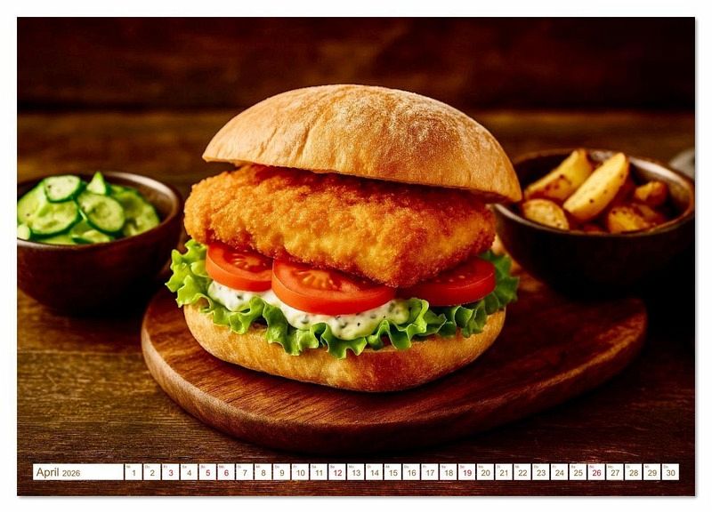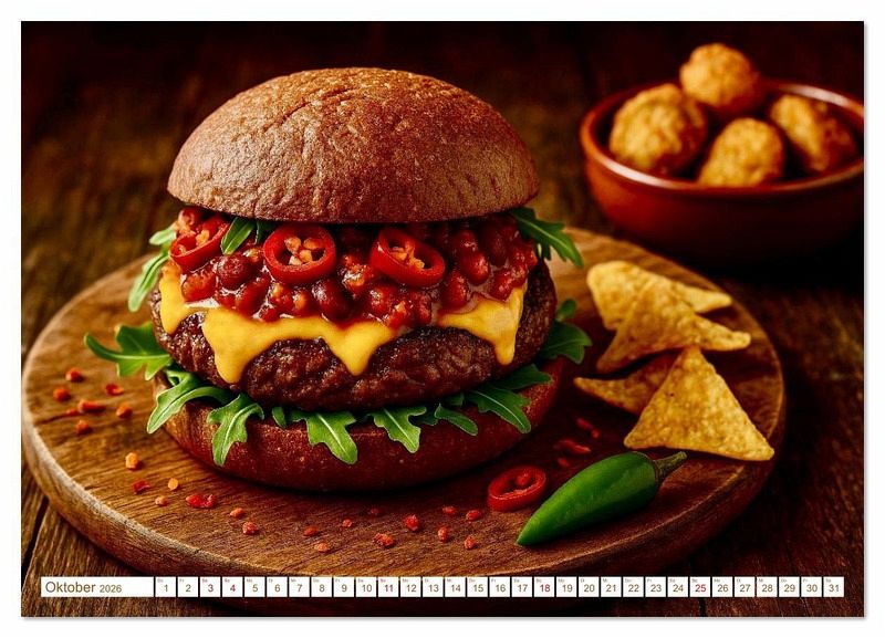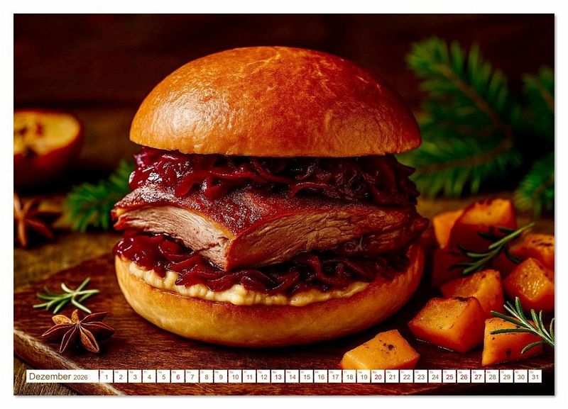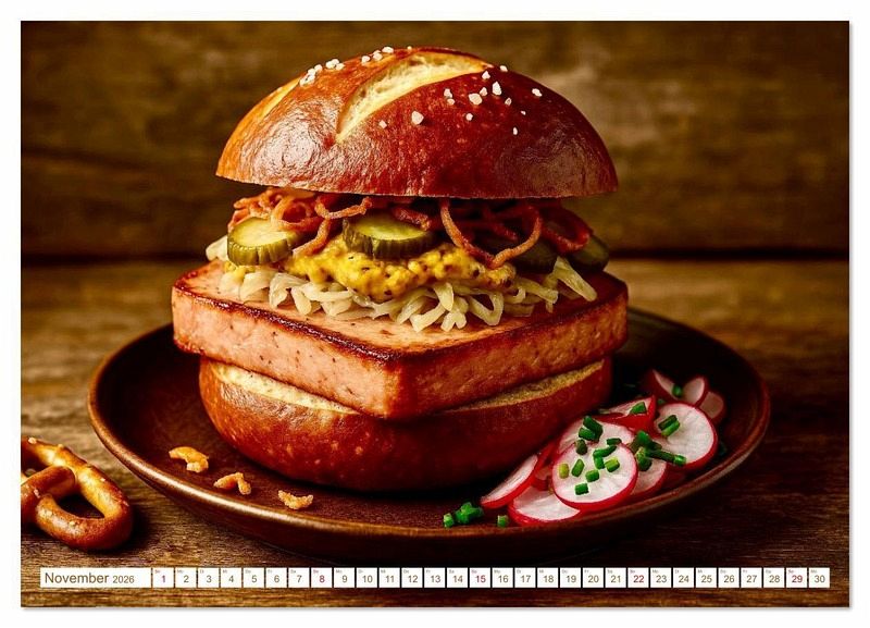 Ob saftiger Leberkäse im Laugenbrötchen, feuriger Chili-Cheeseburger oder festlicher Gänsebraten auf Brioche - dieser Kalender ist ein Fest für alle, die ehrliches Essen und kreative Küche lieben. Jedes Bild, das Steffani Lehmann mit Unterstützung einer KI editiert hat, bringt ein neues Highlight mit sich: detailverliebt fotografiert, stimmungsvoll inszeniert und serviert mit passenden Beilagen von Asia-Gemüse bis Bratkartoffeln.