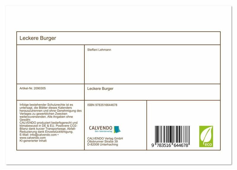 QUALITÄT - Hochwertiger Fotokalender mit 12 wunderschönen Motiven auf lichtbeständigem Bilderdruckpapier, robuste Spiralbindung.NACHHALTIG - deutliche Abfallreduzierung durch bedarfsgerechte Einzelstückfertigung, umweltfreundliches FSC-zertifiziertes Papier, Produktion in Deutschland, klimabewusste Logistik.PERFEKTES GESCHENK - Kalender für Freunde und Familie, für Kinder und Erwachsene, jung und alt, zu Weihnachten, Geburtstag oder zwischendurch.VIELFALT - Bildkalender in verschiedenen Formaten, z.B. DIN A5, DIN A4, DIN A3 sowie DIN A2. Ob Naturmotiv, Gemälde oder Fotos, ideal für ein persönliches Wohlfühlambiente.Burger: Augenschmaus und Gaumeninspiration von Autor(in): Steffani Lehmann
