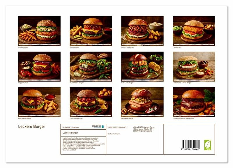 Ob saftiger Leberkäse im Laugenbrötchen, feuriger Chili-Cheeseburger oder festlicher Gänsebraten auf Brioche - dieser Kalender ist ein Fest für alle, die ehrliches Essen und kreative Küche lieben. Jedes Bild, das Steffani Lehmann mit Unterstützung einer KI editiert hat, bringt ein neues Highlight mit sich: detailverliebt fotografiert, stimmungsvoll inszeniert und serviert mit passenden Beilagen von Asia-Gemüse bis Bratkartoffeln.