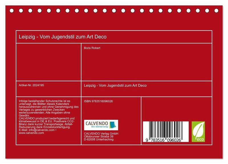 Leipzig ist die heimliche Hauptstadt des Historismus. Mehr als 10.000 Bau- und Kunstdenkmale aus den Jahren 1871 bis 1945 in einer weitgehend erhaltenen Innenstadt - das ist einzigartig in Deutschland. Dieser Kalender spannt den Bogen vom Jugendstil, Ende des 19. Jahrhunderts bis zu den Bauten des Art Deco, die in den zwanziger Jahren des 20. Jahrhunderts ihren Höhepunkt fanden.