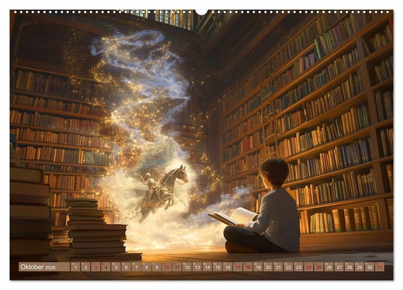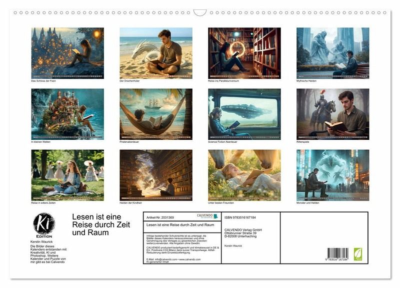 In diesem außergewöhnlichen Kalender begegnen wir Menschen im Moment des Lesens - versunken, still, ganz bei sich. Hinter ihnen erwachen ihre Gedanken zum Leben: Fantasiewelten, Erinnerungen oder Wissen nehmen visuelle Gestalt an. Mithilfe künstlicher Intelligenz wurden diese Szenen kunstvoll inszeniert und verbinden Realität und Vorstellung auf eindrucksvolle Weise. Ein Kalender, der zeigt, wie Lesen innere Welten sichtbar macht.