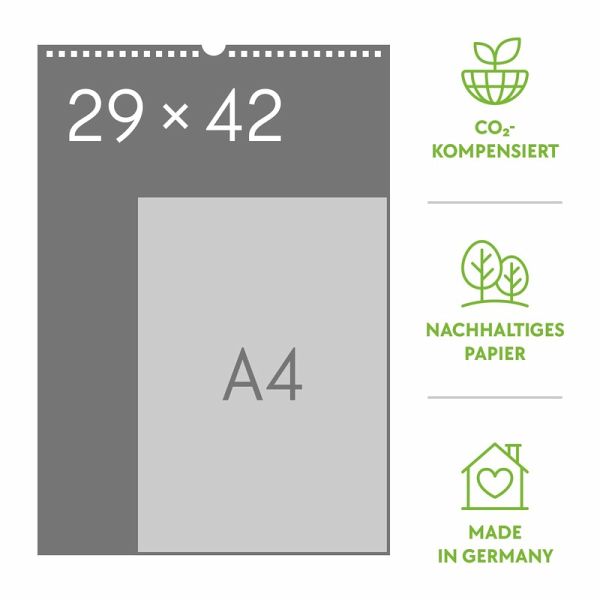 Wie alle Ackermann-Kalender ausschließlich in Deutschland auf Papier gedruckt, das aus vorbildlich bewirtschafteten, FSC®-zertifizierten Wäldern und anderen kontrollierten Quellen stammt. Transparente CO2-Kompensation in Kooperation mit unserem Klimapartner NatureOffice, bei der nachweislich Treibhausgase reduziert sowie die lokale Umwelt und die Belange der Bevölkerung gefördert werden.