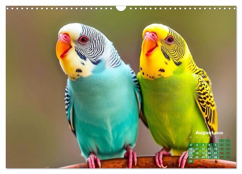Abbildungen: Januar: Regenbogenlori Februar: Goldfink März: Gabelracke April: Eisvogel Mai: Ara Juni: Mandarin Ente Juli: Sonnensittich August: Wellensittiche September: Kolibri Oktober: Papageientaucher November: Papstfink Dezember: Tukan