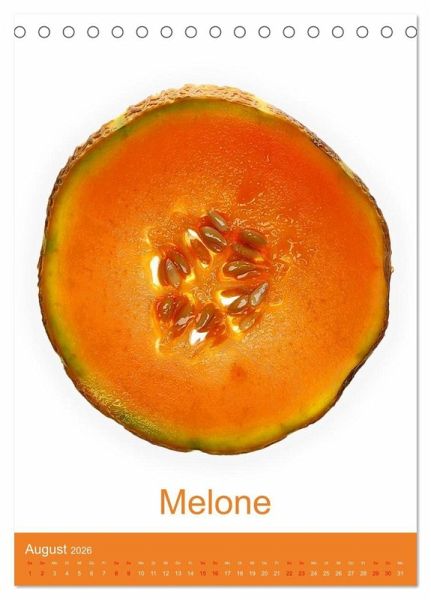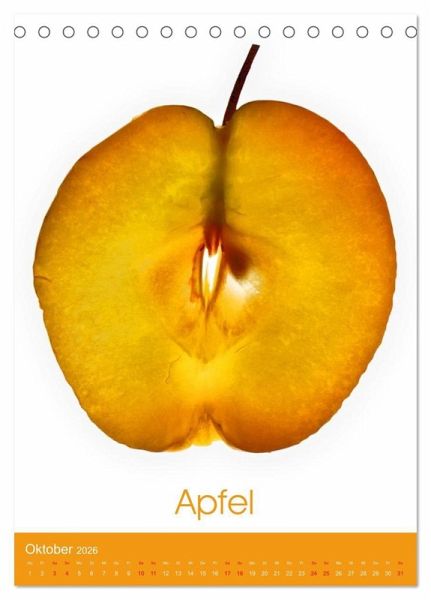 Jede Kalenderseite zeigt ein anderes saisonales Obst oder Gemüse. Die detailreichen Nahaufnahmen zeigen gut ausgeleuchtet die Struktur, Farben und Formen des Innenlebens der abgebildeten Obst und Gemüse Sorten. Ein dekorativer Blickfang für Küche oder Esszimmer.