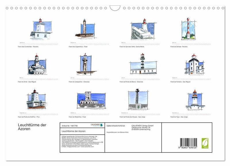 QUALITÄT - Hochwertiger Fotokalender mit 12 wunderschönen Motiven auf lichtbeständigem Bilderdruckpapier, robuste Spiralbindung mit Aufhängebügel.NACHHALTIG - deutliche Abfallreduzierung durch bedarfsgerechte Einzelstückfertigung, umweltfreundliches FSC-zertifiziertes Papier, Produktion in Deutschland, klimabewusste Logistik.PERFEKTES GESCHENK - Kalender für Freunde und Familie, für Kinder und Erwachsene, jung und alt, zu Weihnachten, Geburtstag oder zwischendurch.VIELFALT - Bildkalender in verschiedenen Formaten, z.B. DIN A5, DIN A4, DIN A3 sowie DIN A2. Ob Naturmotiv, Gemälde oder Fotos, ideal für ein persönliches Wohlfühlambiente.Leuchttürme der Sehnsuchtsinseln Azoren - Symbol für Orientierung, für Weite und Heimat finden von Autor(in): Marisa Kirkorowicz