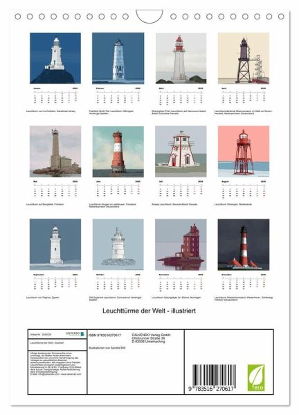 QUALITÄT - Hochwertiger Fotokalender mit 12 wunderschönen Motiven auf lichtbeständigem Bilderdruckpapier, robuste Spiralbindung mit Aufhängebügel.NACHHALTIG - deutliche Abfallreduzierung durch bedarfsgerechte Einzelstückfertigung, umweltfreundliches FSC-zertifiziertes Papier, Produktion in Deutschland, klimabewusste Logistik.PERFEKTES GESCHENK - Kalender für Freunde und Familie, für Kinder und Erwachsene, jung und alt, zu Weihnachten, Geburtstag oder zwischendurch.VIELFALT - Bildkalender in verschiedenen Formaten, z.B. DIN A5, DIN A4, DIN A3 sowie DIN A2. Ob Naturmotiv, Gemälde oder Fotos, ideal für ein persönliches Wohlfühlambiente.Leuchttürme unterschiedlicherster Architektur als Illustrationen visualisiert. von Autor(in): Sandra Brill