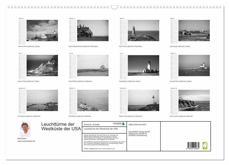 QUALITÄT - Hochwertiger Fotokalender mit 12 wunderschönen Motiven auf lichtbeständigem Bilderdruckpapier, robuste Spiralbindung mit Aufhängebügel.NACHHALTIG - deutliche Abfallreduzierung durch bedarfsgerechte Einzelstückfertigung, umweltfreundliches FSC-zertifiziertes Papier, Produktion in Deutschland, klimabewusste Logistik.PERFEKTES GESCHENK - Kalender für Freunde und Familie, für Kinder und Erwachsene, jung und alt, zu Weihnachten, Geburtstag oder zwischendurch.VIELFALT - Bildkalender in verschiedenen Formaten, z.B. DIN A5, DIN A4, DIN A3 sowie DIN A2. Ob Naturmotiv, Gemälde oder Fotos, ideal für ein persönliches Wohlfühlambiente.Die schönsten Leuchttürme aus Washington, Oregon und Kalifornien von Autor(in): Ralf Kaiser