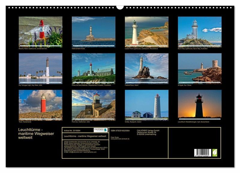 Schon immer waren die Menschen von Leuchttürmen fasziniert. Für die Freunde dieser meist imposanten Bauwerke hat der Fotokünstler Peter Roder zwölf beeindruckende Aufnahmen von Leuchttürmen aus der ganzen Welt zusammengestellt und gestaltet, ein wunderschöner Kalender mit Bildern für das ganze Jahr.