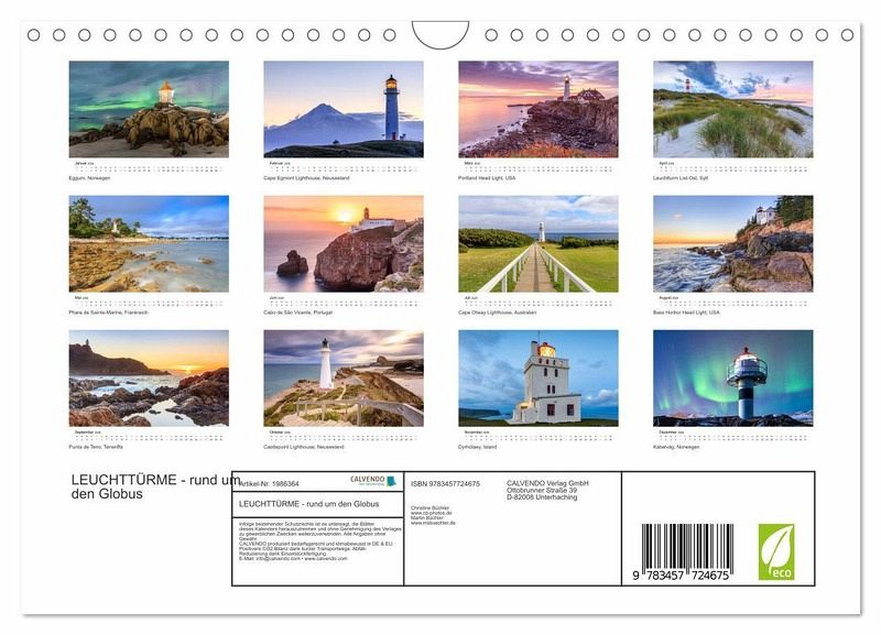 Leuchttürme faszinieren die Menschheit seit Jahrhunderten. Lassen auch Sie sich verzaubern von zwölf besonders schönen Exemplaren aus den unterschiedlichsten Regionen der Welt. Ob in dramatischer Landschaftskulisse aufs Neuseelands Nordinsel, an der pittoresken Ostküste der USA oder an den wilden Küsten Europas - dieser Kalender ist ein Muss für jeden Reisefreund!