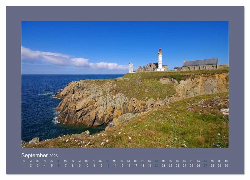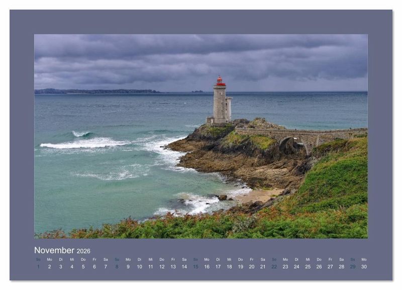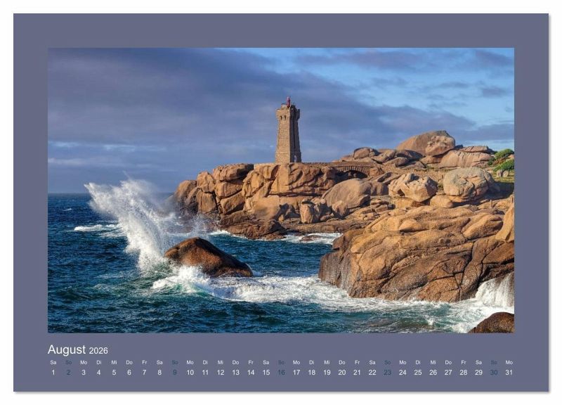 Leuchttürme gehören zu den Wahrzeichen der Bretagne. Klein oder groß, mitten im Meer, auf einer Insel oder an Land, groß und breit oder schmal und elegant - eindrucksvoll sind sie alle. Gerade das Finistère, der äußerste Zipfel Europas, hat viele eindrucksvolle Landspitzen mit ihren Leuchttürmen zu bieten. Da im 19. Jahrhundert die Reichweite der Leuchtfeuer erhöht wurde, sind oftmals zwei oder drei Türme zu sehen. Entdecken sie mit diesem Kalender die Vielfalt dieser maritimen Zeitzeugen - sogar ein Feuerschiff ist mit dabei.