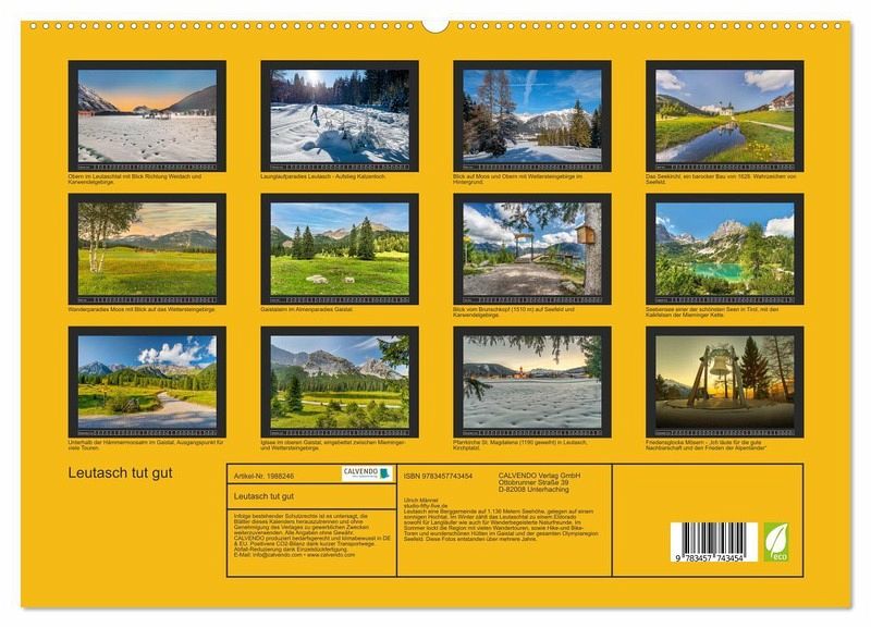 PREMIUM-LINIE - Brillanter Fotokalender mit 12 wunderschönen Motiven, Kunstdruck in Hochglanz in Museumsqualität.QUALITÄT - edle Materialien, stabile Rückwand mit 2 innovativen Einstecktaschen für eine optimale Präsentation an der Wand.NACHHALTIG - deutliche Abfallreduzierung durch bedarfsgerechte Einzelstückfertigung, umweltfreundliches FSC-zertifiziertes Papier, Produktion in Deutschland, klimabewusste Logistik.PERFEKTES GESCHENK - Kalender für Freunde und Familie, für Kinder und Erwachsene, jung und alt, zu Weihnachten, Geburtstag oder zwischendurch.Die Berggemeinde Leutasch liegt in einem sonnigen Hochtal unterteilt in 24 Weiler und umgeben von einer fesselnden Bergkulisse. von Autor(in): studio-fifty-five