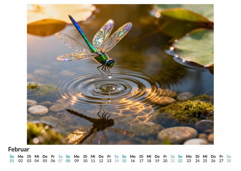 Sie schweben fast unsichtbar durch die Luft, ihre Flügel ein schillerndes Spiel aus Licht und Farbe. Der Kalender "Libelle" fängt die fragile Eleganz dieser Insekten in zwölf einzigartigen Motiven ein, die ihre zarte Gestalt in den Mittelpunkt rücken. Dieser Kalender ist eine gute Wahl für: Liebhaber der Natur und ihrer feinen Details Menschen, die filigrane Ästhetik und klare Formen schätzen Alle, die einen besonderen Wandschmuck suchen, der Ruhe ausstrahlt Jedes Monatsblatt zeigt eine andere Facette der Libelle, von makroskopischen Nahaufnahmen der Flügelstrukturen bis hin zu Kompositionen, die das Insekt in einem fast surrealen Licht darstellen. Die Motive sind nicht in der Natur fotografiert oder von menschlicher Hand gestaltet. Sie wurden durch das Zusammenspiel von kreativen Impulsen und komplexen Algorithmen erschaffen, um eine neue, digitale Interpretation dieser Geschöpfe zu visualisieren. Der Fokus liegt auf der grafischen Schönheit und den faszinierenden Texturen. Mit dem Kauf dieses Kalenders kann man Folgendes erwarten: Zwölf Monatsmotive rund um das Thema Libellen Eine Komposition aus filigranen Details und schillernden Farbverläufen Ein praktisches Kalendarium, das sich dezent in das Design einfügt Der Kalender "Libelle" ist eine Hommage an die zarte Schönheit dieser Insekten und verbindet Naturinspiration mit digitaler Gestaltung. Ein Blick in die Monatsvorschau offenbart die Vielfalt der Motive, die durch das Jahr begleiten.