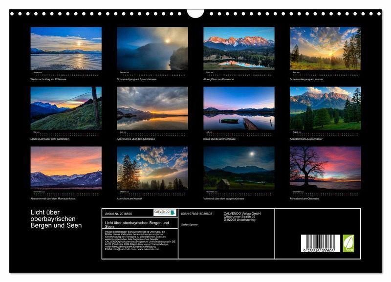 Die oberbayrische Alpenregion ist wegen ihrer Schönheit ein beliebtes Urlaubs- und Wanderziel. Majestätische Bergmassive und idyllische Seen laden immer wieder zum Verweilen und ehrfürchtigen Staunen ein. Die zwölf Bilder des Kalenders fangen die besonderen Lichtstimmungen, in welche die Landschaft getaucht wird, auf faszinierende Weise ein.