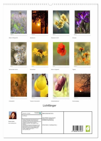 PREMIUM-LINIE - Brillanter Fotokalender mit 12 wunderschönen Motiven, Kunstdruck in Hochglanz in Museumsqualität.QUALITÄT - edle Materialien, stabile Rückwand mit 2 innovativen Einstecktaschen für eine optimale Präsentation an der Wand.NACHHALTIG - deutliche Abfallreduzierung durch bedarfsgerechte Einzelstückfertigung, umweltfreundliches FSC-zertifiziertes Papier, Produktion in Deutschland, klimabewusste Logistik.PERFEKTES GESCHENK - Kalender für Freunde und Familie, für Kinder und Erwachsene, jung und alt, zu Weihnachten, Geburtstag oder zwischendurch.Wunderschöne Lichtmomente - Die Welt der Blumen und Pflanzen in sehr zarten lichtdurchfluteten Detailaufnahmen von Autor(in): Fotokunst Ulrike Ada