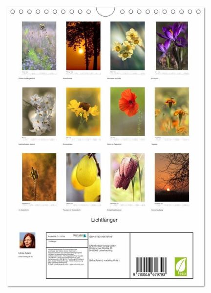 QUALITÄT - Hochwertiger Fotokalender mit 12 wunderschönen Motiven auf lichtbeständigem Bilderdruckpapier, robuste Spiralbindung mit Aufhängebügel.NACHHALTIG - deutliche Abfallreduzierung durch bedarfsgerechte Einzelstückfertigung, umweltfreundliches FSC-zertifiziertes Papier, Produktion in Deutschland, klimabewusste Logistik.PERFEKTES GESCHENK - Kalender für Freunde und Familie, für Kinder und Erwachsene, jung und alt, zu Weihnachten, Geburtstag oder zwischendurch.VIELFALT - Bildkalender in verschiedenen Formaten, z.B. DIN A5, DIN A4, DIN A3 sowie DIN A2. Ob Naturmotiv, Gemälde oder Fotos, ideal für ein persönliches Wohlfühlambiente.Wunderschöne Lichtmomente - Die Welt der Blumen und Pflanzen in sehr zarten lichtdurchfluteten Detailaufnahmen von Autor(in): Fotokunst Ulrike Adam