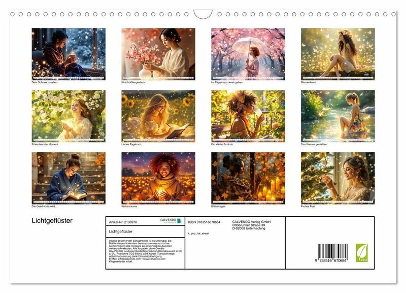 Dieser Kalender fängt die Magie des Jahres ein. Tauche ein in eine Welt voller Ruhe und Besinnlichkeit, in der junge Frauen in traumhaften, leuchtenden Szenen dargestellt werden. Jedes Monatsbild ist ein einzigartiges Kunstwerk, das mit unzähligen Funkeln, glitzernden Lichteffekten und sanften Farben verzaubert. Ein Jahr voller Lichtgeflüster, das die Seele wärmt und dir jeden Tag ein Lächeln schenkt. Ein perfektes Geschenk für alle, die sich nach etwas Zauber und Magie im Alltag sehnen. Alle Bilder wurden mit KI generiert und aufwendig bearbeitet.