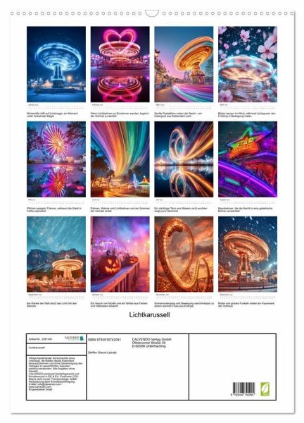 Lass dich mitreißen von den funkelnden Spuren der Nacht. Jede Aufnahme ist ein kleines Feuerwerk der Sinne - farbig, lebendig und voller Gefühl. Dieser Kalender lädt dich ein, die Welt mit staunenden Augen zu sehen, und verwandelt jeden Raum in einen Ort voller Licht und Freude. Ein Jahr, das inspiriert, begeistert und einfach glücklich macht. Alle hier gezeigten Bilder wurden mit Sorgfalt, Liebe und mit Hilfe einer KI generiert. Abschließend werden sie mit Bildbearbeitungsprogrammen überarbeitet und in den Kalender eingefügt.