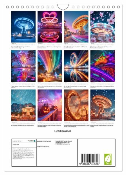 Lass dich mitreißen von den funkelnden Spuren der Nacht. Jede Aufnahme ist ein kleines Feuerwerk der Sinne - farbig, lebendig und voller Gefühl. Dieser Kalender lädt dich ein, die Welt mit staunenden Augen zu sehen, und verwandelt jeden Raum in einen Ort voller Licht und Freude. Ein Jahr, das inspiriert, begeistert und einfach glücklich macht. Alle hier gezeigten Bilder wurden mit Sorgfalt, Liebe und mit Hilfe einer KI generiert. Abschließend werden sie mit Bildbearbeitungsprogrammen überarbeitet und in den Kalender eingefügt.