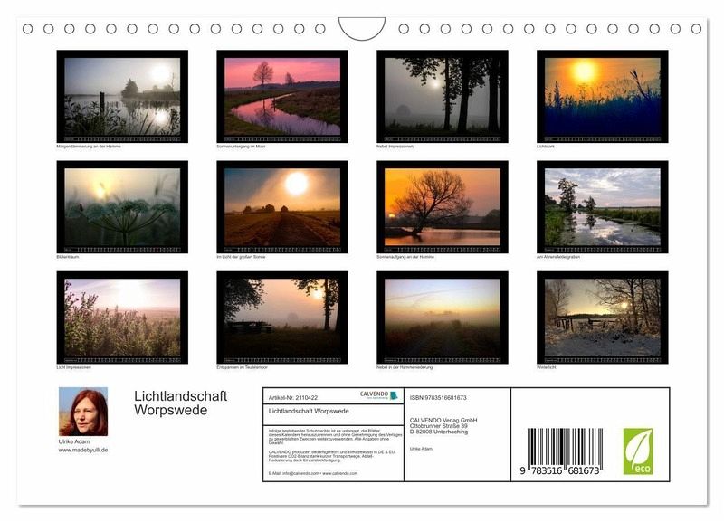 QUALITÄT - Hochwertiger Fotokalender mit 12 wunderschönen Motiven auf lichtbeständigem Bilderdruckpapier, robuste Spiralbindung mit Aufhängebügel.NACHHALTIG - deutliche Abfallreduzierung durch bedarfsgerechte Einzelstückfertigung, umweltfreundliches FSC-zertifiziertes Papier, Produktion in Deutschland, klimabewusste Logistik.PERFEKTES GESCHENK - Kalender für Freunde und Familie, für Kinder und Erwachsene, jung und alt, zu Weihnachten, Geburtstag oder zwischendurch.VIELFALT - Bildkalender in verschiedenen Formaten, z.B. DIN A5, DIN A4, DIN A3 sowie DIN A2. Ob Naturmotiv, Gemälde oder Fotos, ideal für ein persönliches Wohlfühlambiente.Lichtdurchflutete Fotos der Landschaft um Worpswede im Teufelsmoor von Autor(in): Fotokunst Ulrike Adam