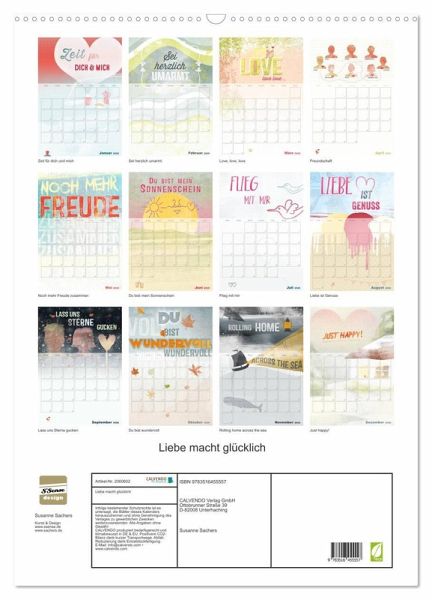 Dieser Kalender erinnert uns jeden Tag an das größte Geschenk in unserem Leben, die Liebe. Ein ideales Geschenk für Liebende, Poeten, Träumer, Freunde, Familien und alle Geliebten. Zwölf wundervolle Illustrationen, gestaltet von der deutschen Künstlerin und Designerin Susanne Sachers, www.ssense.de, www.sachers.de, beglücken das ganze Jahr hindurch.