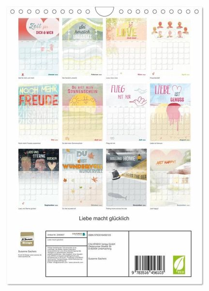 Dieser Kalender erinnert uns jeden Tag an das größte Geschenk in unserem Leben, die Liebe. Ein ideales Geschenk für Liebende, Poeten, Träumer, Freunde, Familien und alle Geliebten. Zwölf wundervolle Illustrationen, gestaltet von der deutschen Künstlerin und Designerin Susanne Sachers, www.ssense.de, www.sachers.de, beglücken das ganze Jahr hindurch.