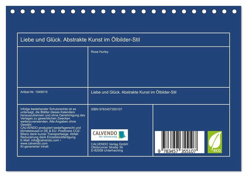 QUALITÄT - Hochwertiger Fotokalender mit 12 wunderschönen Motiven auf lichtbeständigem Bilderdruckpapier, robuste Spiralbindung.NACHHALTIG - deutliche Abfallreduzierung durch bedarfsgerechte Einzelstückfertigung, umweltfreundliches FSC-zertifiziertes Papier, Produktion in Deutschland, klimabewusste Logistik.PERFEKTES GESCHENK - Kalender für Freunde und Familie, für Kinder und Erwachsene, jung und alt, zu Weihnachten, Geburtstag oder zwischendurch.VIELFALT - Bildkalender in verschiedenen Formaten, z.B. DIN A5, DIN A4, DIN A3 sowie DIN A2. Ob Naturmotiv, Gemälde oder Fotos, ideal für ein persönliches Wohlfühlambiente.Ein kunstvoller Kalender, der Liebe und Glück im abstrakten Ölgemälde-Stil zeigt von Autor(in): Rose Hurley