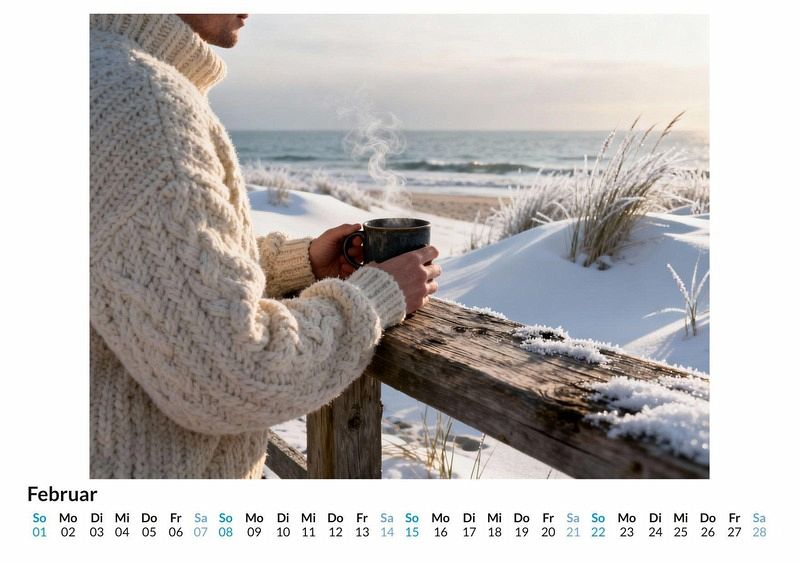 Die Sehnsucht nach der Weite des Horizonts, dem Geruch von Salzwasser und dem Gefühl von Sand unter den Füßen ist ein ständiger Begleiter für viele Menschen. Dieser Kalender fängt genau dieses Gefühl ein und bringt es nach Hause. Der Kalender ist eine wunderbare Wahl für: Menschen mit einer tiefen Verbundenheit zum Meer. Alle, die das maritime Flair im Alltag nicht missen möchten. Suchende nach einem besonderen Geschenk für Küstenliebhaber. Der Kalender "Liebe zur Küste" begleitet durch das Jahr mit zwölf Motiven, die die vielfältige Schönheit der Küstenregionen zeigen. Von rauen Klippen, an denen sich die Gischt bricht, über sanfte Dünenlandschaften im Abendlicht bis hin zu stillen Hafenmomenten erzählt jeder Monat eine eigene kleine Geschichte. Die Monatsbilder sind das Ergebnis eines kreativen Prozesses, bei dem aus reiner Vorstellungskraft und digitaler Berechnung einzigartige Küstenszenen komponiert wurden. Jedes Bild lädt dazu ein, die maritime Atmosphäre auf sich wirken zu lassen. Beim Kauf dieses Kalenders kann man Folgendes erwarten: Zwölf sorgfältig ausgewählte maritime Motive für jeden Monat. Ein praktisches Kalendarium für die persönliche Jahresplanung. Ein dekorativer Wandschmuck, der das ganze Jahr über Freude bereitet. Der Kalender "Liebe zur Küste" ist mehr als nur ein Zeitplaner. Er ist eine tägliche Einladung, gedanklich an die Küste zu reisen und die Seele für einen Moment baumeln zu lassen. Eine Entdeckungsreise durch die Monate erwartet den Betrachter.