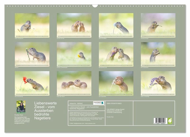 Die Naturfotografin Perdita Petzl portraitiert seit Jahren und mit viel Liebe die possierlichen und sehr seltenen Ziesel. Mit ihrem Sinn für den richtigen Moment schafft sie es die putzigen Nagetiere in allerlei lustigen Situationen festzuhalten. Dieser hervorragende Kalender zaubert dem Betrachter unweigerlich ein Lächeln ins Gesicht. Ein absolutes Muss für Ziesel-Liebhaber und Tierfreunde!
