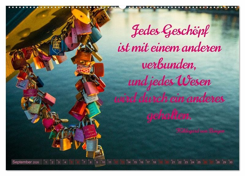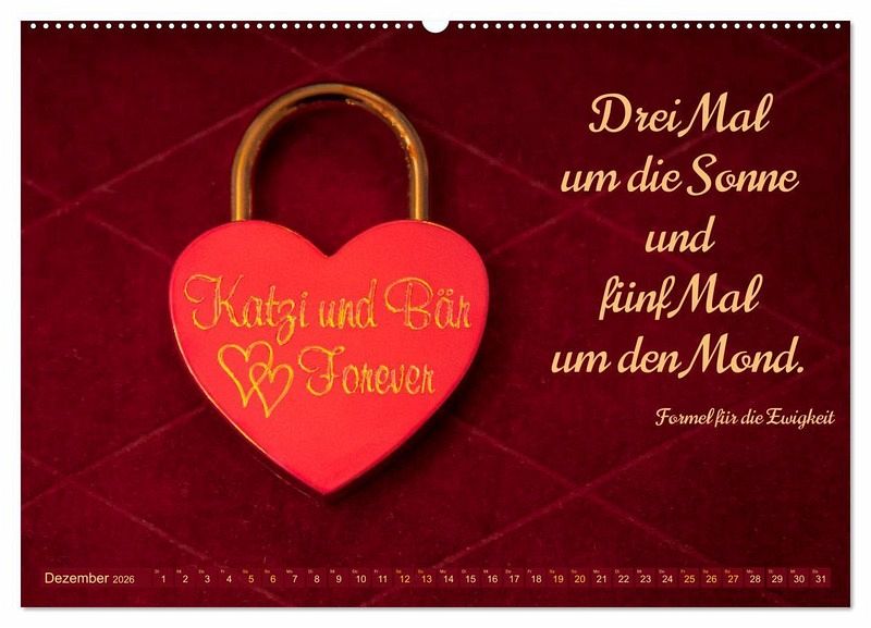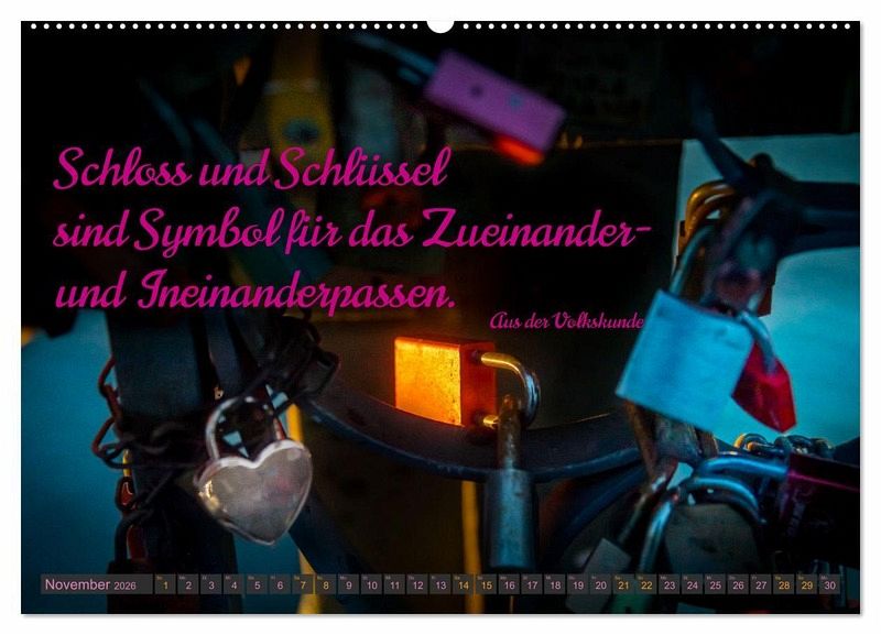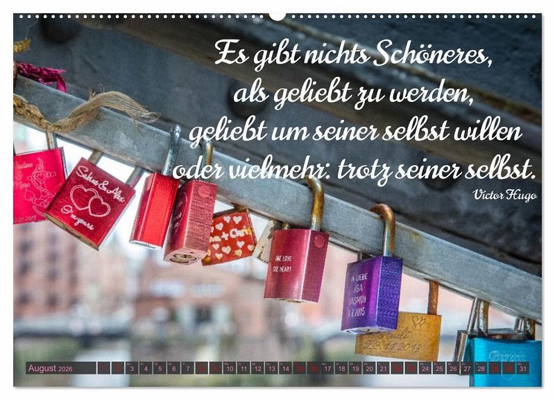 Endlich: Der Kalender für den Kult um die künstlerisch gestalteten Vorhängeschlösser als Zeichen der Liebe. Während die Schlösser Symbol für ewige Verbundenheit sind, stehen die Brücken, an die sie meistens gehängt werden, für die Vereinigung vormals getrennter Welten. Den Kalender zieren neben brillanten Fotografien von Liebesschlössern passende Liebeszitate und Sprüche. Damit wird er zum perfekten Präsent für alle Liebenden und ist eine Liebeserklärung der besonderen Art.