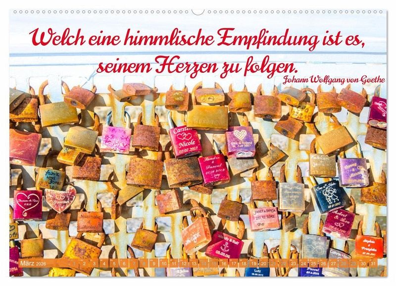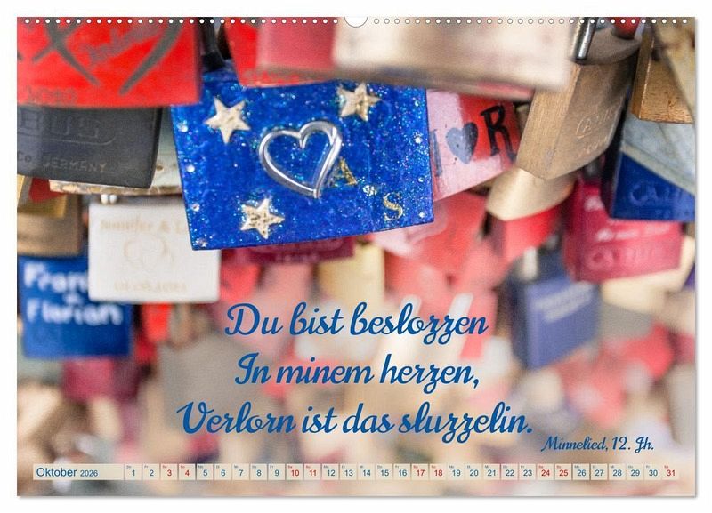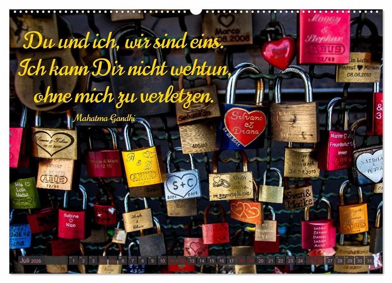 Endlich: Der Kalender für den Kult um die künstlerisch gestalteten Vorhängeschlösser als Zeichen der Liebe. Während die Schlösser Symbol für ewige Verbundenheit sind, stehen die Brücken, an die sie meistens gehängt werden, für die Vereinigung vormals getrennter Welten. Den Kalender zieren neben brillanten Fotografien von Liebesschlössern passende Liebeszitate und Sprüche. Damit wird er zum perfekten Präsent für alle Liebenden und ist eine Liebeserklärung der besonderen Art.