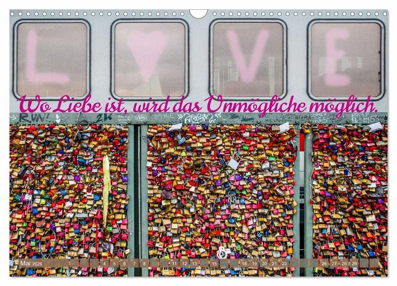 Endlich: Der Kalender für den Kult um die künstlerisch gestalteten Vorhängeschlösser als Zeichen der Liebe. Während die Schlösser Symbol für ewige Verbundenheit sind, stehen die Brücken, an die sie meistens gehängt werden, für die Vereinigung vormals getrennter Welten. Den Kalender zieren neben brillanten Fotografien von Liebesschlössern passende Liebeszitate und Sprüche. Damit wird er zum perfekten Präsent für alle Liebenden und ist eine Liebeserklärung der besonderen Art.