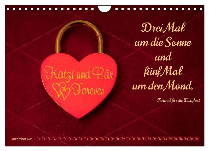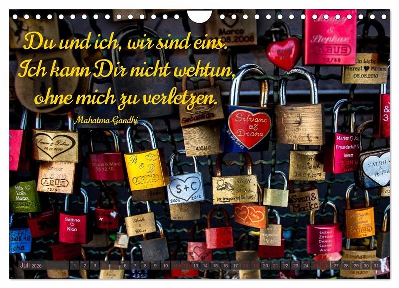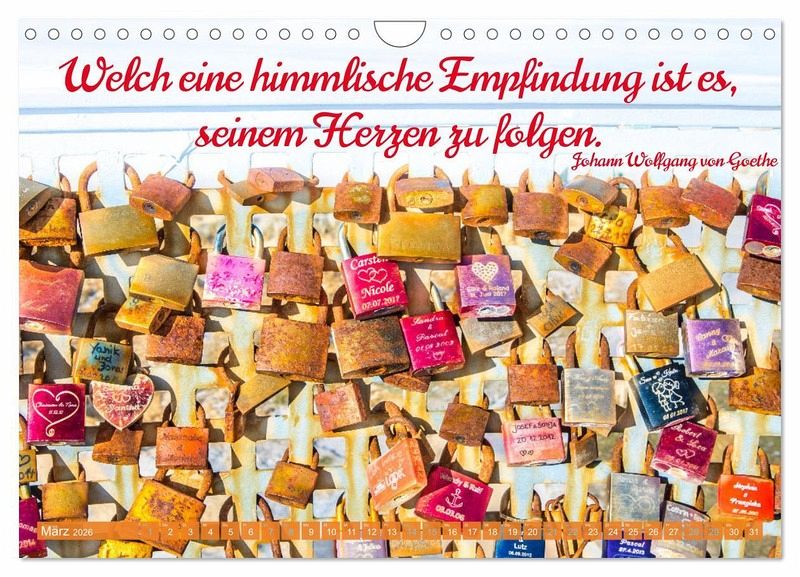 Endlich: Der Kalender für den Kult um die künstlerisch gestalteten Vorhängeschlösser als Zeichen der Liebe. Während die Schlösser Symbol für ewige Verbundenheit sind, stehen die Brücken, an die sie meistens gehängt werden, für die Vereinigung vormals getrennter Welten. Den Kalender zieren neben brillanten Fotografien von Liebesschlössern passende Liebeszitate und Sprüche. Damit wird er zum perfekten Präsent für alle Liebenden und ist eine Liebeserklärung der besonderen Art.