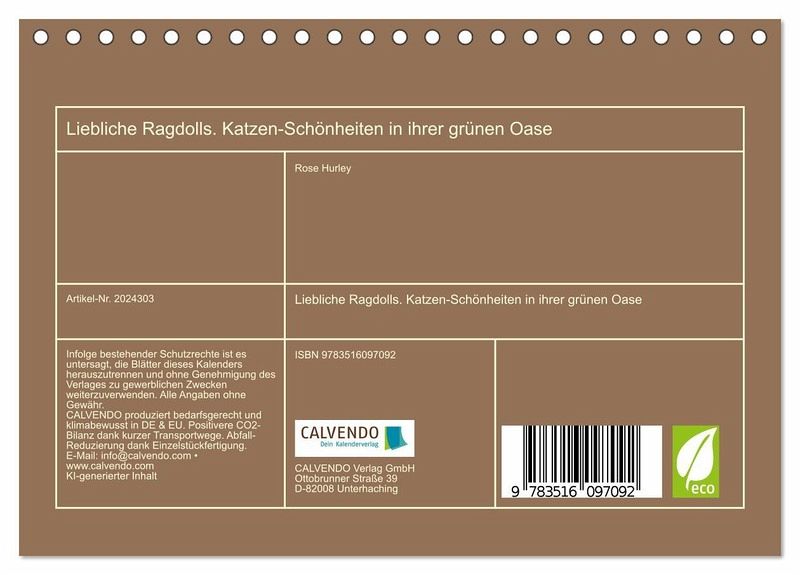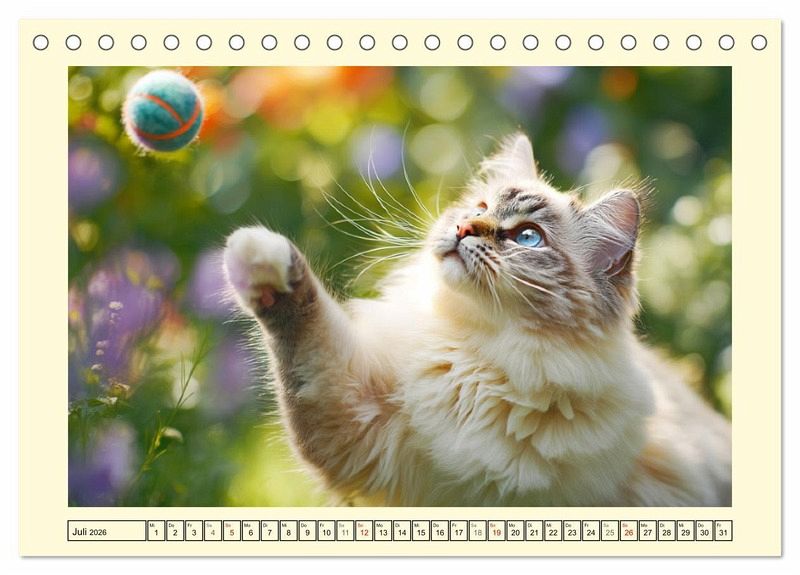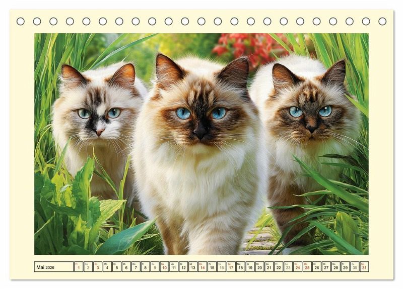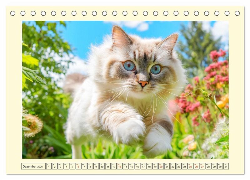 Die Ragdoll-Katze begeistert mit ihrem ruhigen Gemüt, ihrem seidigen Fell und ihren ausdrucksstarken blauen Augen. In diesem liebevoll gestalteten Kalender erleben wir diese faszinierenden Tiere in einem traumhaften Garten - verspielt, neugierig und voller Anmut. Die Bilder wurden mit Hilfe von ki erstellt und fangen Momente voller Leichtigkeit und Harmonie ein. Jede Szene erzählt eine kleine Geschichte über die besondere Art, wie Ragdolls ihre Umgebung erleben - charmant, freundlich und mit viel Lebensfreude.