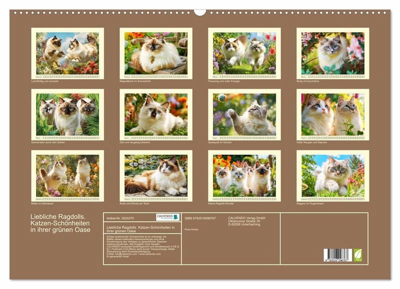 Die Ragdoll-Katze begeistert mit ihrem ruhigen Gemüt, ihrem seidigen Fell und ihren ausdrucksstarken blauen Augen. In diesem liebevoll gestalteten Kalender erleben wir diese faszinierenden Tiere in einem traumhaften Garten - verspielt, neugierig und voller Anmut. Die Bilder wurden mit Hilfe von ki erstellt und fangen Momente voller Leichtigkeit und Harmonie ein. Jede Szene erzählt eine kleine Geschichte über die besondere Art, wie Ragdolls ihre Umgebung erleben - charmant, freundlich und mit viel Lebensfreude.