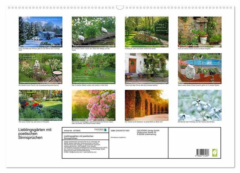 QUALITÄT - Hochwertiger Fotokalender mit 12 wunderschönen Motiven auf lichtbeständigem Bilderdruckpapier, robuste Spiralbindung mit Aufhängebügel.NACHHALTIG - deutliche Abfallreduzierung durch bedarfsgerechte Einzelstückfertigung, umweltfreundliches FSC-zertifiziertes Papier, Produktion in Deutschland, klimabewusste Logistik.PERFEKTES GESCHENK - Kalender für Freunde und Familie, für Kinder und Erwachsene, jung und alt, zu Weihnachten, Geburtstag oder zwischendurch.VIELFALT - Bildkalender in verschiedenen Formaten, z.B. DIN A5, DIN A4, DIN A3 sowie DIN A2. Ob Naturmotiv, Gemälde oder Fotos, ideal für ein persönliches Wohlfühlambiente.Romantische Gärten mit sinnlicher Poesie von Autor(in): Konstanze Junghanns