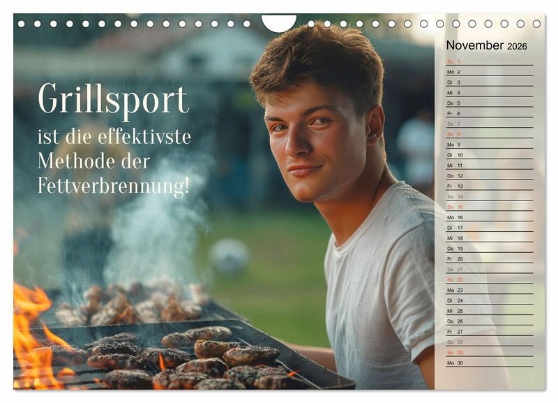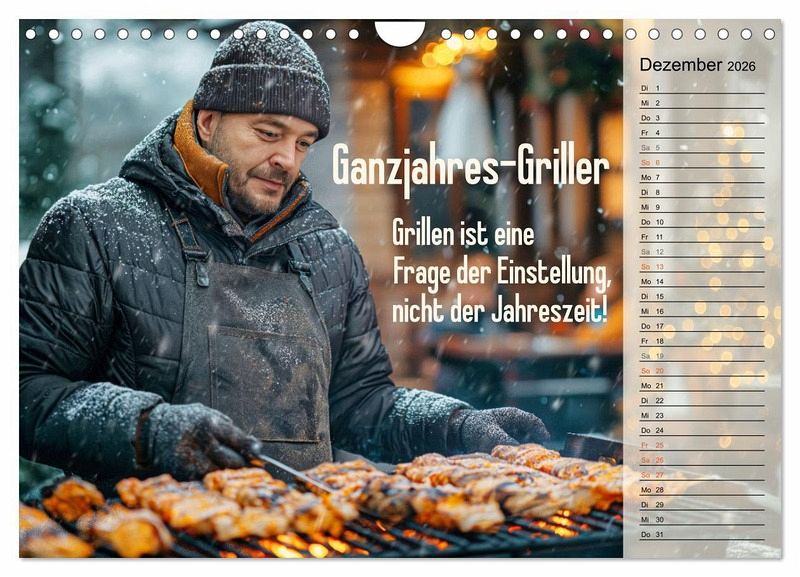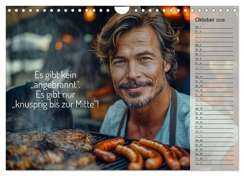 Grillen ist nicht nur ein Hobby, sondern eine Lebensphilosophie! Unser Lieblingsduft? Frisch gegrilltes Fleisch mit einem Hauch von Rauch. Unser Lieblingsgeräusch? Das Zischen des Steaks, wenn es auf den Rost trifft. Also: Grill an und Würstchen raus! Wann? Wann immer wir Lust haben! Die Termine halten wir in diesem Kalender mit witzigen Grillsprüchen und passenden KI-Bildern fest.