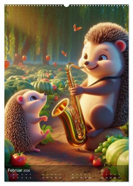 Februar: Der kleine Igel spielt auf seinem Saxophon eine Melodie, so weich und warm.