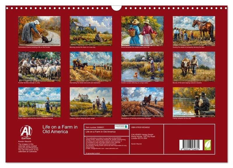 Immerse yourself in the picturesque world of the American pioneer era with our unique calendar. Each image tells a story of simple pleasures, intimately connected to the beauty of rural life. Thanks to our innovative AI technology, we have put together a collection of fascinating paintings that capture the authentic feel of the era.