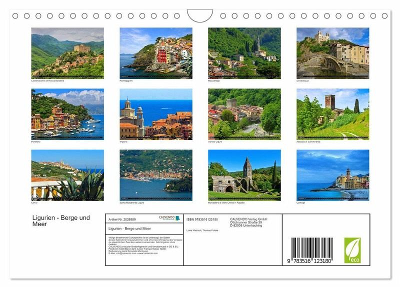 Dieser Kalender nimmt Sie mit auf eine Reise durch die vielfältigen Landschaften Liguriens. Abwechslungsreiche Fotos führen von den Seealpen über die Dörfer des Ligurischen Apennins bis zur Küste der Riviera und der Cinque Terre.