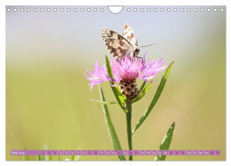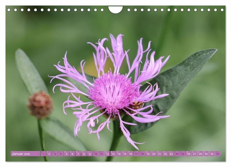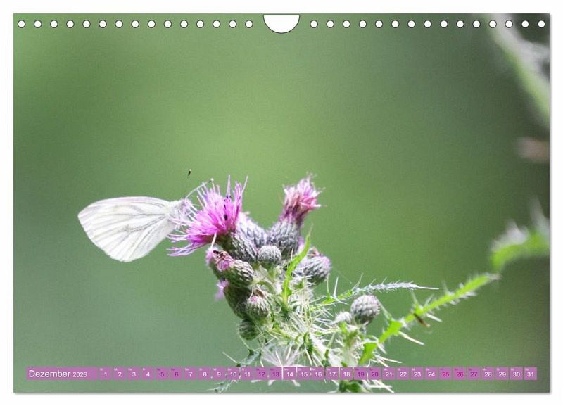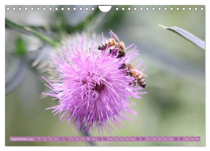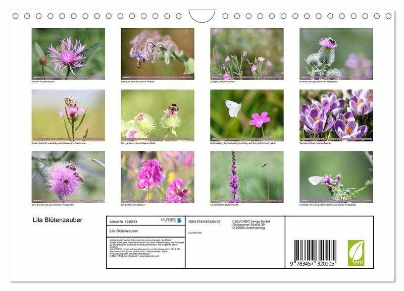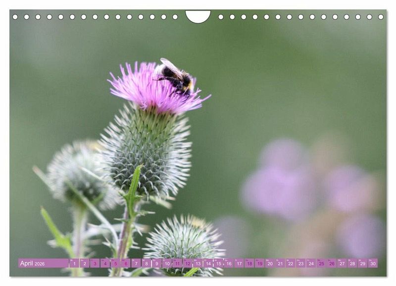 Dieser exklusive Kalender nimmt Sie mit auf eine faszinierende Reise durch das Jahr. Lassen Sie sich jeden Monat von der sanften Eleganz der lila Blüten verzaubern, begleitet von ihren Besuchern, die diese prächtigen Blumen bevölkern. Ob der majestätische Schmetterling auf einer Wiesen-Flockenblume im Mai oder die fleißigen Bienen, die im September auf einer Distel summen - dieser Kalender fängt die harmonische Verbindung zwischen Blüten und ihren geflügelten Gästen perfekt ein.
