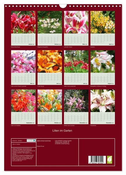 QUALITÄT - Hochwertiger Fotokalender mit 12 wunderschönen Motiven auf lichtbeständigem Bilderdruckpapier, robuste Spiralbindung mit Aufhängebügel.NACHHALTIG - deutliche Abfallreduzierung durch bedarfsgerechte Einzelstückfertigung, umweltfreundliches FSC-zertifiziertes Papier, Produktion in Deutschland, klimabewusste Logistik.PERFEKTES GESCHENK - Kalender für Freunde und Familie, für Kinder und Erwachsene, jung und alt, zu Weihnachten, Geburtstag oder zwischendurch.VIELFALT - Bildkalender in verschiedenen Formaten, z.B. DIN A5, DIN A4, DIN A3 sowie DIN A2. Ob Naturmotiv, Gemälde oder Fotos, ideal für ein persönliches Wohlfühlambiente.Prachtvoll leuchtende Lilien in der Natur von Autor(in): Gisela Kruse