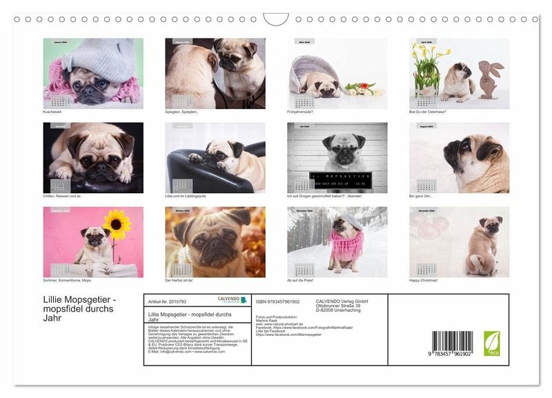 QUALITÄT - Hochwertiger Fotokalender mit 12 wunderschönen Motiven auf lichtbeständigem Bilderdruckpapier, robuste Spiralbindung mit Aufhängebügel.NACHHALTIG - deutliche Abfallreduzierung durch bedarfsgerechte Einzelstückfertigung, umweltfreundliches FSC-zertifiziertes Papier, Produktion in Deutschland, klimabewusste Logistik.PERFEKTES GESCHENK - Kalender für Freunde und Familie, für Kinder und Erwachsene, jung und alt, zu Weihnachten, Geburtstag oder zwischendurch.VIELFALT - Bildkalender in verschiedenen Formaten, z.B. DIN A5, DIN A4, DIN A3 sowie DIN A2. Ob Naturmotiv, Gemälde oder Fotos, ideal für ein persönliches Wohlfühlambiente.Lillie das Mopsmädchen begleitet Sie im farbenfrohen, abwechslungreichen Kalender durch Ihren Alltag von Autor(in): MartinaRaab