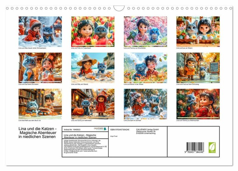 Entdecken Sie die zauberhafte Welt von Lina und ihren treuen Katzenfreunden! Dieser liebevoll gestaltete KI-generierten Kalender zeigt die kleinen und großen Abenteuer, die Lina und ihre niedlichen blauen Katzen in verschiedenen Jahreszeiten erleben. Von winterlichen Schneeballwerfen über frühlingshafte Blumenspiele bis hin zu sommerlichen Ausflügen in den Eisdiele - jeder Monat entführt Sie in eine neue, magische Szene. Perfekt für alle, die eine Mischung aus Nostalgie, Fantasie und herzerwärmender Niedlichkeit lieben. Ob für das eigene Zuhause oder als Geschenk für Katzenliebhaber und Träumer - dieser Kalender ist ein echter Hingucker und bringt das ganze Jahr über Freude!