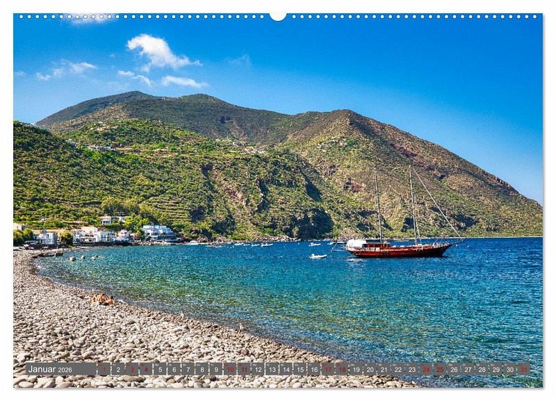 Januar: Strand und Hafen von Filicudi mit dem Capo Graziano und einer Florette einem historischen zweimastigen Segelschiff