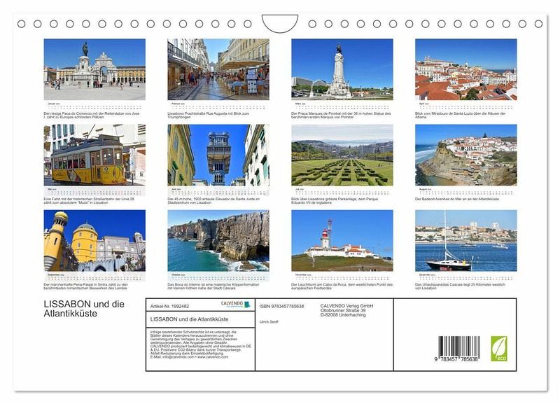 Lissabon mit seinem großartigen Flair gilt als eine der weltweit schönsten Städte. In der Tat ist Portugals Metropole ein ungemein lebendiger, charismatischer und gastlicher Ort mit vielen Touristenattraktionen. Darüberhinaus hat sich die Stadt ihre lange und bewegte Geschichte bewahrt. Der Autor präsentiert im Kalender einige seiner beeindruckendsten Fotos dieser faszinierenden Stadt, sowie von der nicht minder sehenswerten Umgebung zwischen dem Weltkulturerbe Sintra mit dem märchenhaften Pena-Palast und Cascais, dem wunderschönen Seebad an der Atlantikküste.