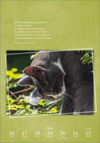 - Die Katze in Lyrik und Literatur: Ein bildschöner Jahres-Wandkalender für alle, die charakterstarke Samtpfoten zu schätzen wissen- Ausdrucksstarke Katzenfotos treffen auf zarte Poesie: Hochwertiger Bildkalender mit 53 originellen Katzen-Porträts und Literatur-Auszügen bekannter Autor:innen- Die treffendsten Zitate, Romanauszüge und Gedichte über die eigenwilligen Stubentiger: Ein edles Geschenk für Katzenliebhaber:innen- Ein dekoratives Highlight an jeder Wand: Kalender im kompakten 25 x 35,5 cm-Format- Das Beste aus Kunst und Kultur: Die Wochenkalender von Harenberg aus dem Athesia Kalenderverlag