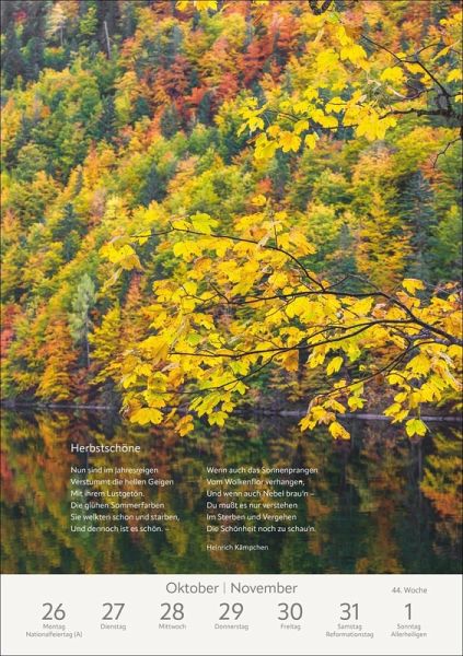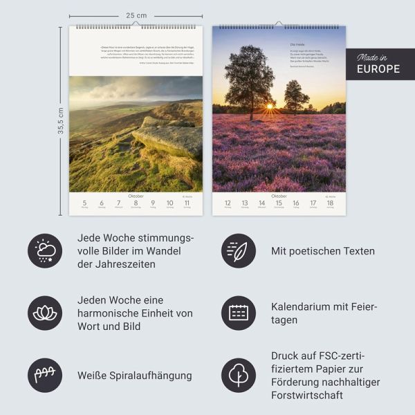 - Ein literarischer Streifzug durch die Natur: Kalender 2026, mit beeindruckenden Fotografien und passenden Zitaten- Poetische Reise-Inspiration für jede Wand: Kalender, der zum Träumen verführt- Die passende Ergänzung zum heimischen Bücherregal: Fotokalender im Format 25 x 35,5 cm mit 53 hochwertigen Texten und Aufnahmen- Das ideale Geschenk für Buchliebhaber und Naturfreunde: Landschafts-Wandkalender 2026 mit der Extraportion Poesie- Kunstvolle Wochen-Kulturkalender für jeden Geschmack: Bildkalender der Marke Harenberg im Athesia Kalenderverlag