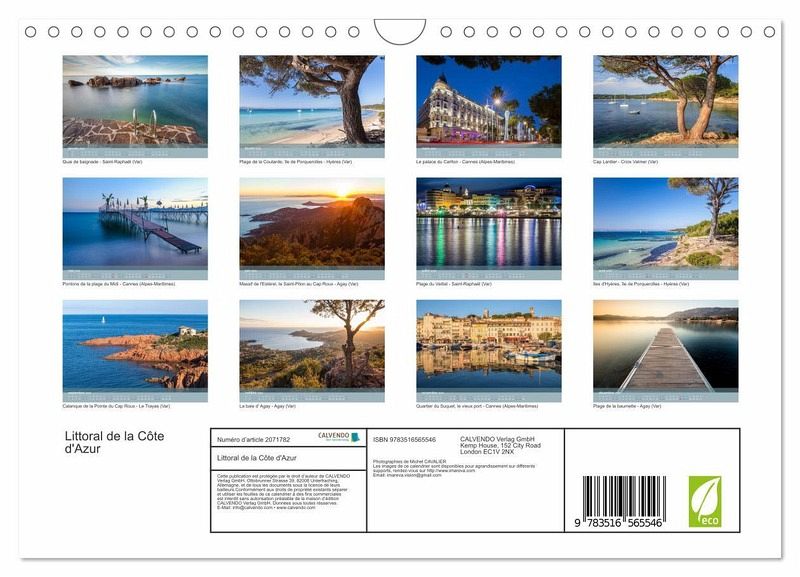 La Côte d'Azur est l'une des premières destinations touristiques de France, retrouvez mois après mois les sites les plus grandioses ou emblématiques du littoral azuréen. Ce calendrier vous propose de découvrir une sélection de magnifiques photographies qui donne à rêver.Calendrier mensuel, les jours fériés sont mentionnés.